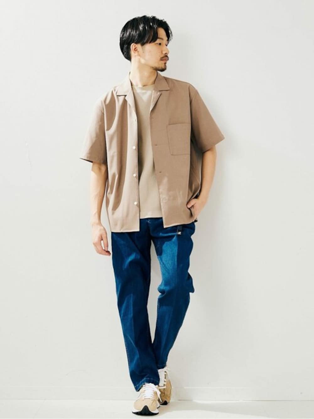 【Reflax】オープンカラーシャツ 30代前半/身長:178cm/体型:やせ型/普段サイズ:L/着用サイズ:L コーディネートポイント:ベージュ×デニムのカジュアルコーディネート。トップスに季節素材を入れる事で春夏感を演出しています。 着心地・サイズ感:Lサイズで程よくややリラックスしたサイズ。とろみがあり落ち感が出る生地なのでやや大きめで着るのもお勧めです。