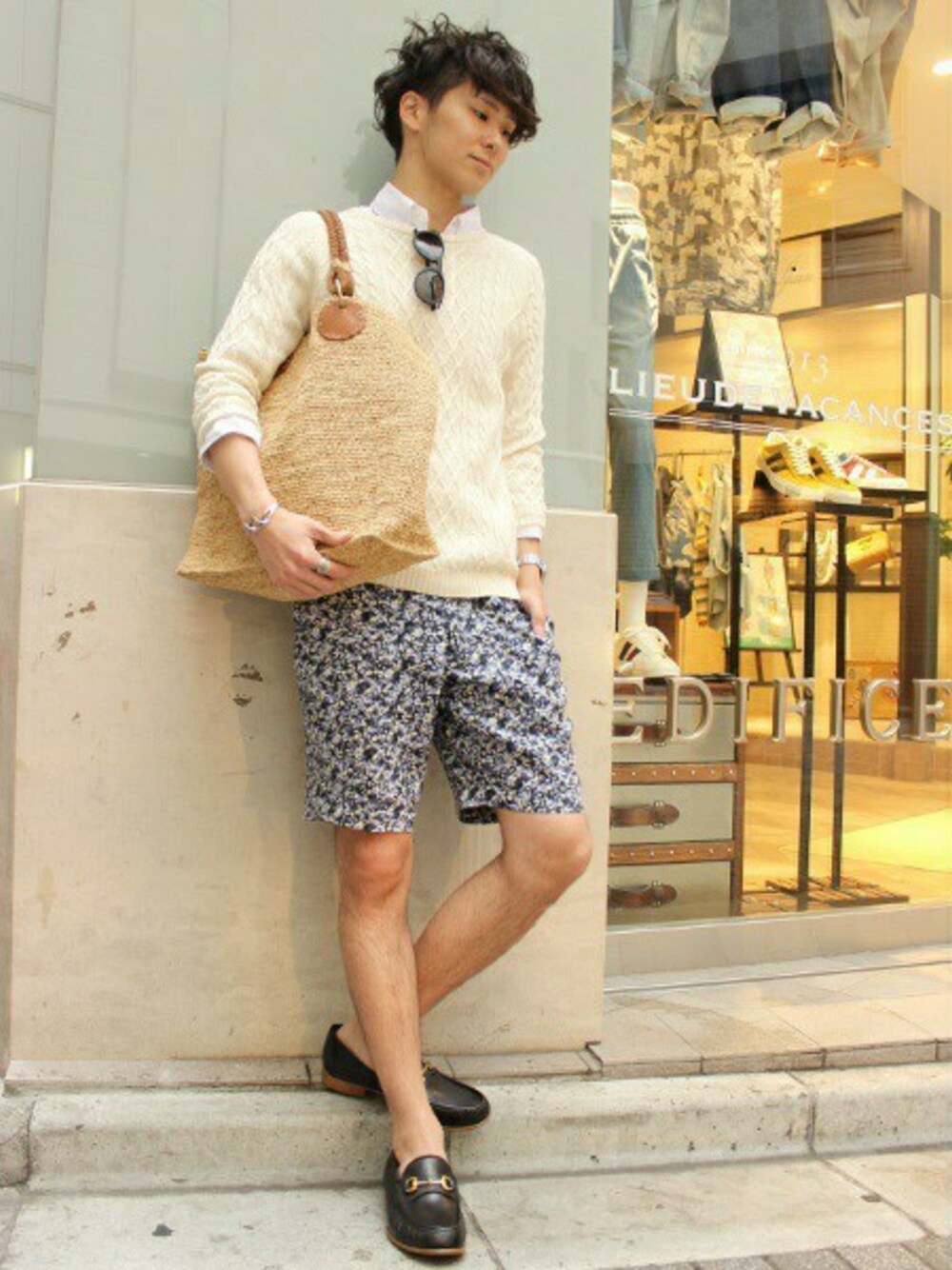 上質なラフィア素材を使用したフランス発のブランド、サンアルシデのトートバッグを、上品なリゾートスタイルに提案。