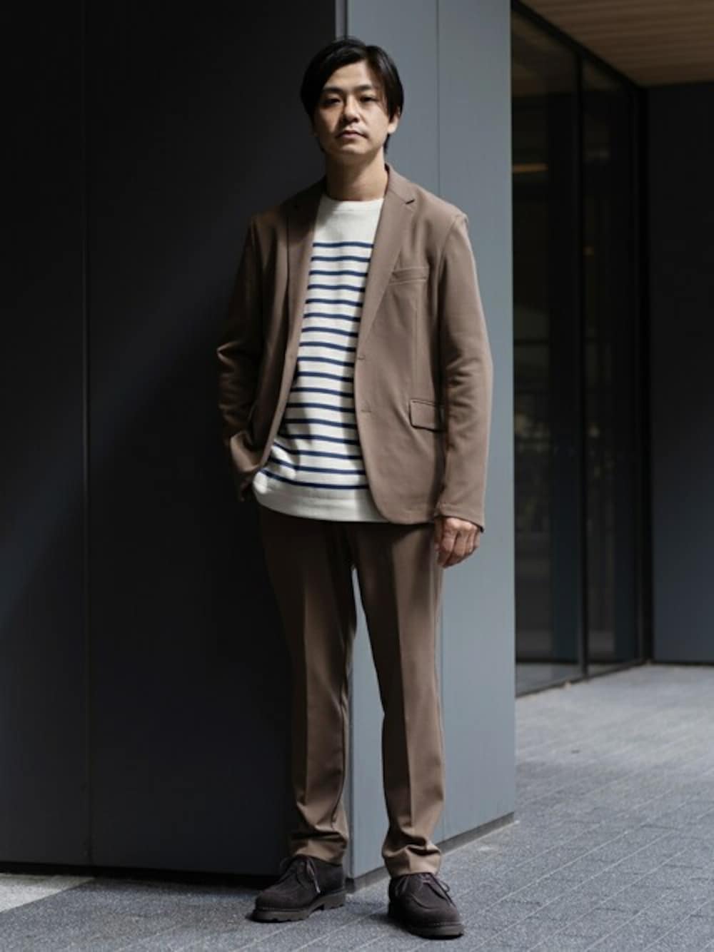”WEB限定”【ジャケット+パンツの2点セット】スペシャルセットアップ ONもOFFもいける万能セットアップ。 レザーシューズでかっちりしつつも、インナーのボーダーが 良い塩梅に、抜け感を演出してくれます。