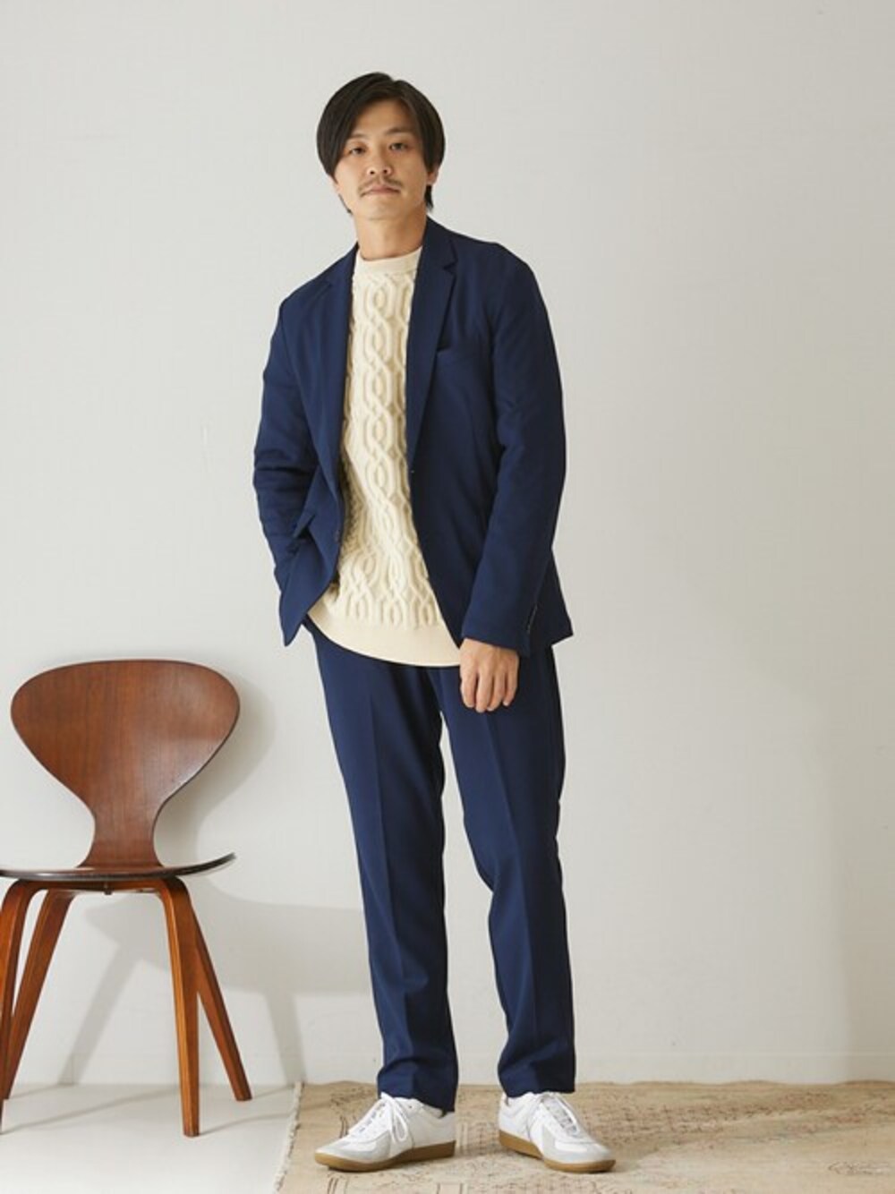 ”WEB限定”【ジャケット+パンツの2点セット】スペシャルセットアップ インナーにケーブル網のポリエステルニットを合わせた、トラッドと現代的な素材の融合させたスタイリング。 ネイビー×ホワイトの王道の組み合わせは、着る人を選びません。