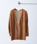 "ミドルゲージに編まれた、リネンライクなカーディガン” 通気性の良さとひんやりとした肌触りが特徴的です。蒸し暑い時期でも、ちょっとした体温調節にピッタリなアイテム。ボタンレスで、裾のリブが無いのでサラっと簡単に羽織って頂けます。 袖口と裾のカーリングしたディテールがアクセントになっています。カラーリングも落ち着いた展開なので、大人っぽさを演出出来ます。シャツはもちろん、Tシャツに合わせて袖まくりのようなスタイリングもおススメ。 今から、真夏まで着て頂けるストレスを感じさせないカーディガンになっています。 ********************** ・透け感:あり ・裏地:なし ・伸縮性:あり ・光沢感:なし ・生地の厚さ: ふつう **********************