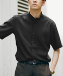 ■素材 ポリエステル素材のシアサッカー生地。サッカーの凹凸感とポリエステルのシャリ感が合わさった清涼感溢れる生地感です。 ■デザイン、シルエット やや細めのシルエットのバンドカラーシャツ。フロントを開けて羽織りアイテムとしてカジュアル使い~ジャケットのインナー・ビジネスカジュアルでの1枚使用まで幅広く活躍するアイテム。サッカー生地の凹凸感もデザインポイントです。