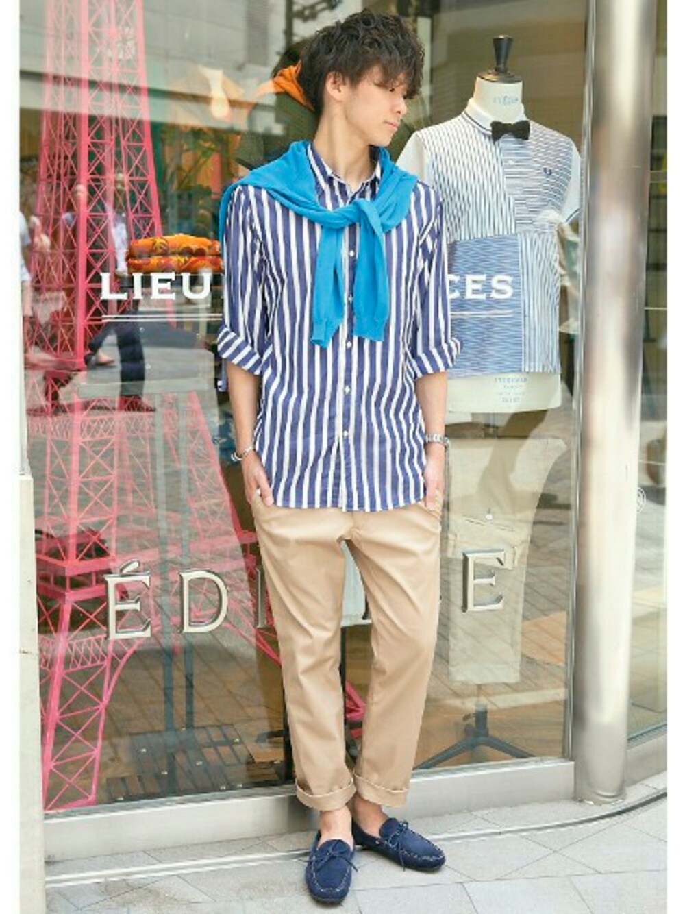 シャツ、チノといったデイリーなあわせながらもロールアップで変化をつけ、夏らしいアクセントをあたえています。