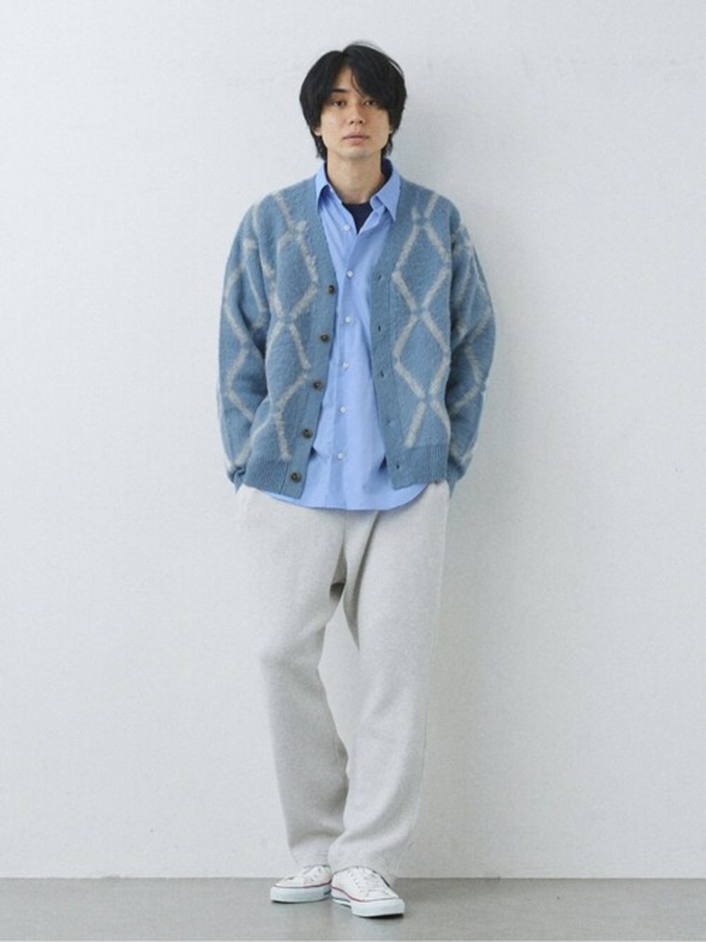 シャギージガラ カーディガン ■素材 アクリル素材ながら、毛足のあるモヘアの風合いが特徴の素材です。 ■デザイン・シルエット ビンテージモヘアカーディガンをベースに、毛足をしっかりと出した大柄のアーガイル地柄のカーディガンに仕上げました。 ゆったりとしたシルエット、発色の良いカラーリングでスタイリングに鮮度が出る一着です。