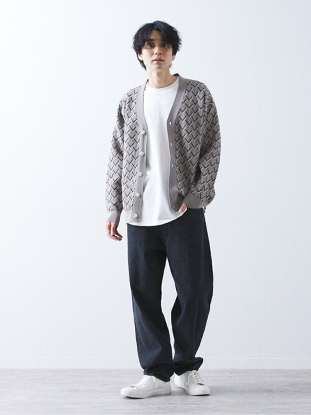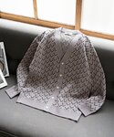 ジオメパターン ジャガードカーディガン ■素材 ハリ感のあるポリエステル素材。凹凸感の素材感は着用時に着映えします。 カリッとした生地感で半袖の上からサラリと着用でき、ロングシーズン活躍します。 ■デザイン・シルエット  上品な雰囲気のある柄を使用したややリラックスシルエットのカーディガン型。袖口や裾のリブテンションも弱めなのでカットソーの上からさらりと着用するのがお勧めです。
