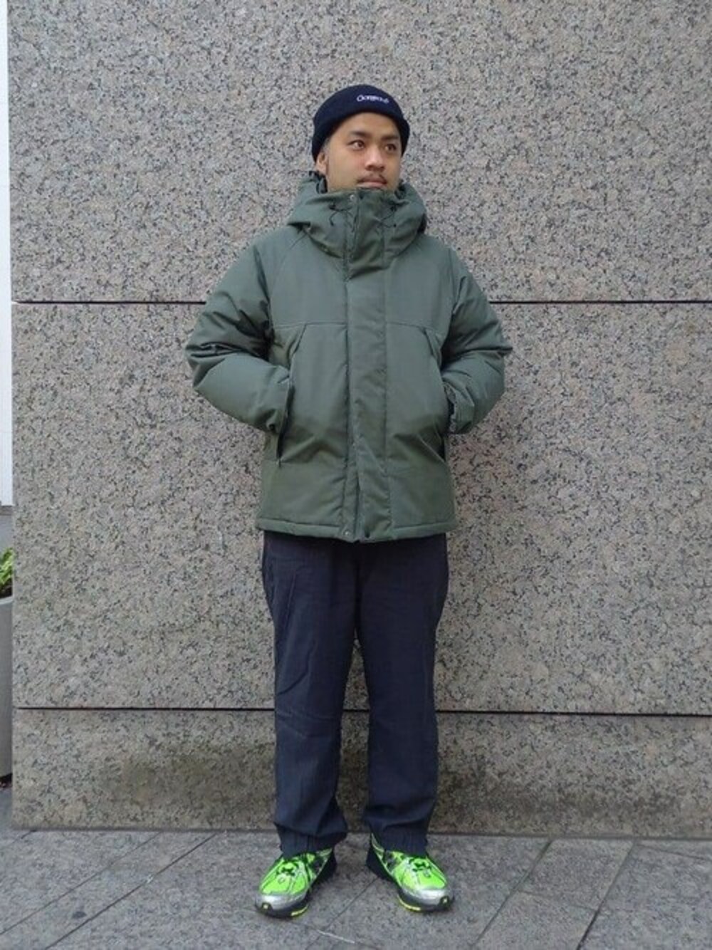 【outer : ALLIED MOUNTAIN DOWN】 ◯着用カラー: カーキ ◯着用サイズ:M ◯サイズ感:ゆったりめのシルエット ◯素材感:ダウンの量もボリューミー過ぎず程よい ◎スタイリングポイント◎ カーキのALLIED MOUNTAIN DOWNを軸にスタイリング。 休日、楽に動けるようなナイロンパンツとスウェットをチョイス。ベーシックなカラーリングになりがちなので、足元には蛍光グリーンのnew balanceを差し色にスタイリング。 ダウンを脱いだ際もお洒落になるよう、ブロッキングされた色切り替えスウェットで個性をプラス