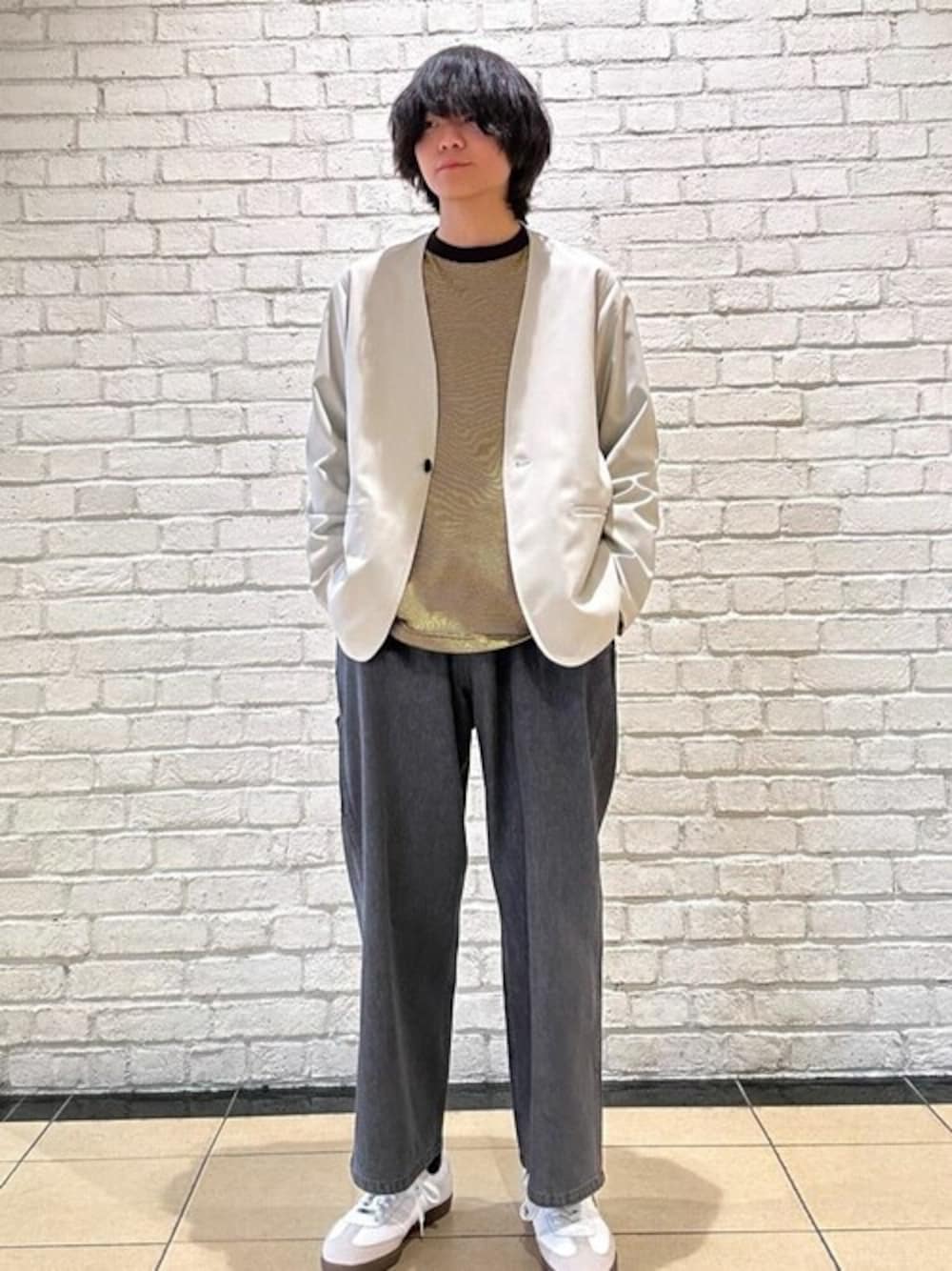 アムンゼンノーカラージャケット 普段サイズ:M/着用サイズ:M/体型:痩せ型/サイズ感:ややゆったり 綺麗目な印象のノーカラージャケットのインナーに差し色で黄色のボーダーを入れることにより春らしいカジュアルなコーデに仕上げました。 ■デザイン・シルエット 立体感のあるノーカラージャケット。カジュアルながらしっかりとした仕立てが魅力です。柔らかく、シワになりづらい万能ジャケットです。