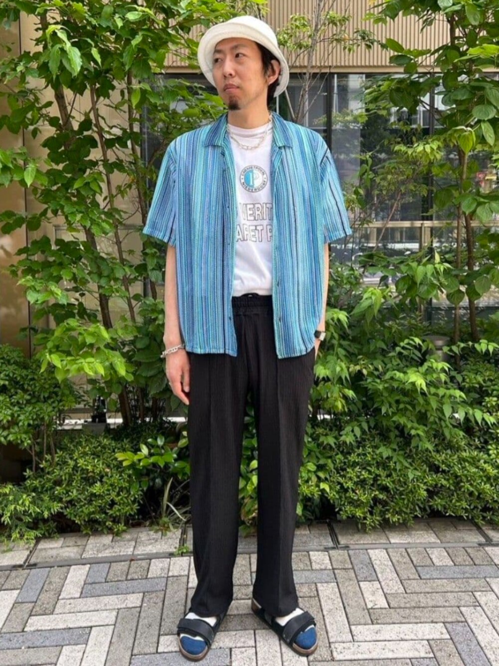 『ラッセルOPシャツ』 ブルーにグリーンと多色合わさってデザインされた417のオリジナルのシャツになっています! 身長 : 185㎝ / 普段サイズ :LorXL / 着用サイズ : L :ややゆったりめ。 素材感 : 柔らかい。 着心地 : ゆったりとしていて動き易い。