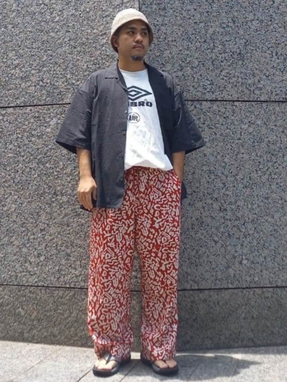 【Tシャツ : UMBRO×LINEUP logo tee / ロゴTシャツ】 ◯着用カラー:ホワイト ◯着用サイズ:XL ◯サイズ感:ゆったりめ ◎スタイリングポイント◎ ①トレンドキーワードであるサッカーTシャツを軸に ②夏の素材であるサッカー生地のシャツを羽織物としてチョイス ③スポーティーになりすぎない様に総柄イージーパンツを合わせ、普段着としてサッカーTシャツを取り入れられる様にコーディネート