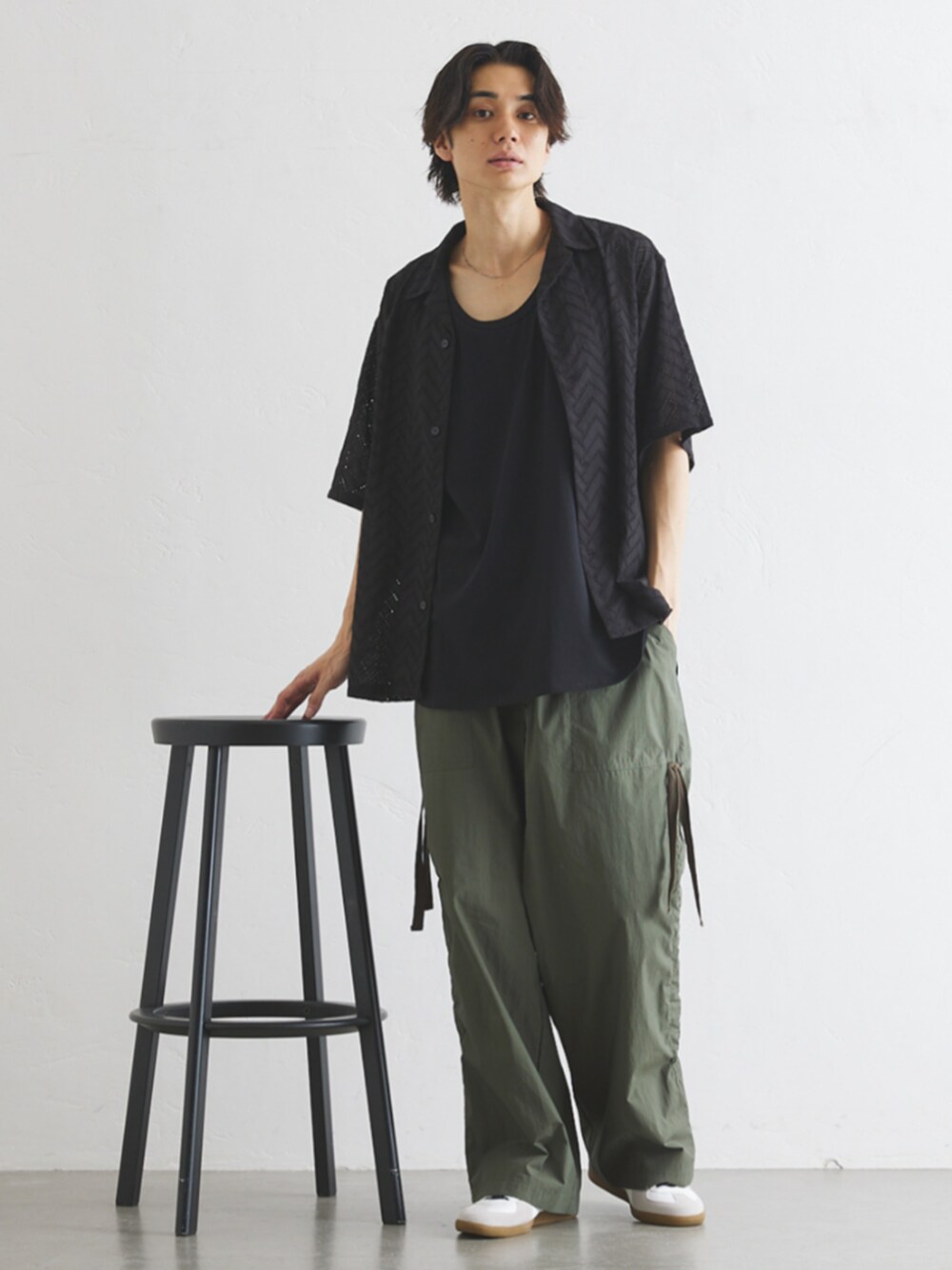 身長:180㎝ / 普段サイズ: L / 体型:やせ型 Military Wide Cargo Pants / ミリタリーカーゴパンツ 素材は高密度の綿ナイロンのワッシャー仕上げ。天然見えの表情と、洗いざらし感のあるコットンタイプライターシャツのような軽くて、ハリのある清涼感のある生地です。 ナイロン混なので薄手ながら、しっかりとハリコシもある素材感。綿100%生地のように肌に張り付きずらく、サラッとしたタッチも特徴です。 湿度の高い時期でも快適に着用頂けます。 デザインは、ベイカーポケットとM65カーゴにあるような止血テープのディティールをベースにイージーパンツに落とし込みをしています。 軽く絞りを入れることによって、カジュアルな見え方になるだけでなく、フラットにして上品に履くことも勿論可能です。 サンダル、スニーカーなどソールの厚みやスタイリングによってサイドアジャストで丈感のアレンジを効かせられるのが特徴です。