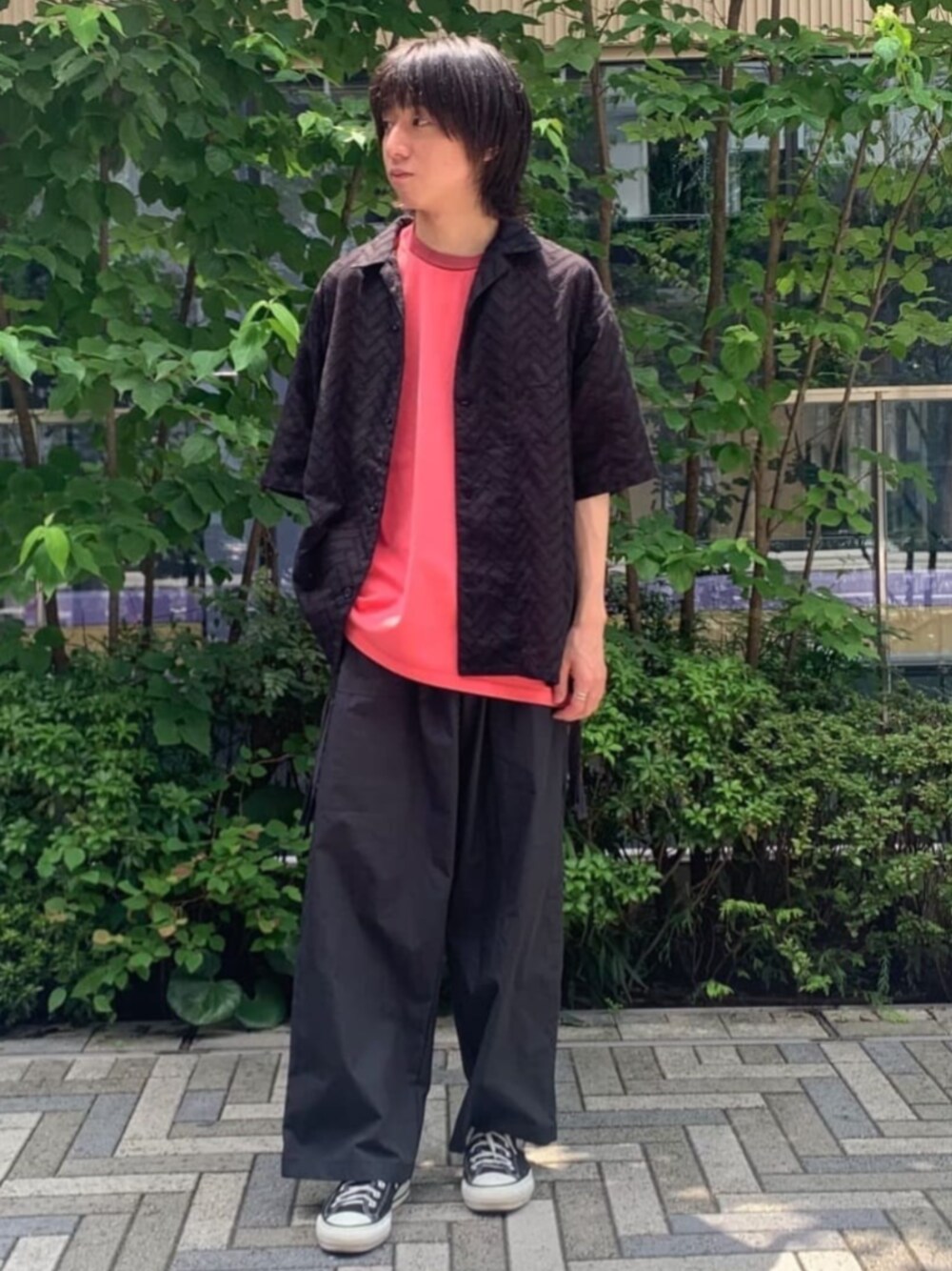 Embroidery オープンシャツ 普段サイズ:S 着用サイズ:M 透け感のあるシャツを主役にしたスタイリング。 透け感を活かすため、発色の良いTシャツをインナーとして使用した。 サイズ感:全体的にゆとりのあるサイズ感。肘が隠れるくらいの袖丈。 素材感:程よくハリ感のある、コットン素材。 着心地:風通しが良く、軽いため、夏でも快適に着用可能。