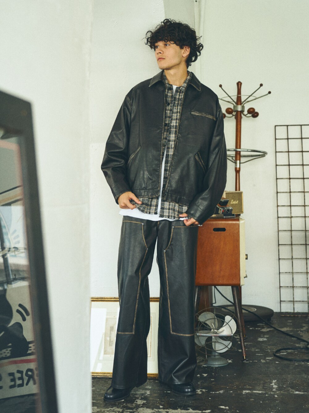 身長:180㎝ / 普段サイズ: L / 体型:やせ型 フェイクレザー ジップアップジャケット ”シボ感のあるフェイクレザーのワークブルゾン” 身幅のあるワイドで短丈シルエット。縫い目に色落ち加工を施し、ビンテージレザーにある茶芯のようなあたり感を表現し、雰囲気ある仕上がりとなっています。 昨今、注目を浴びている加工やクラフト感があるレザー。417ではフェイクレザーを用いレザーの経年変化、エイジングを表現しています。 羽織ればデニムパンツでもクリーンなスラックスでもコーデュロイパンツでも、カジュアルにもストリート風にもスタイリングの外しにも、相性の良い万能の一着になると思います。 同素材の組下もご用意しています。 24030312524030 フェイクレザーダブルニーパンツ 長いシーズン活躍するおすすめの一着です。