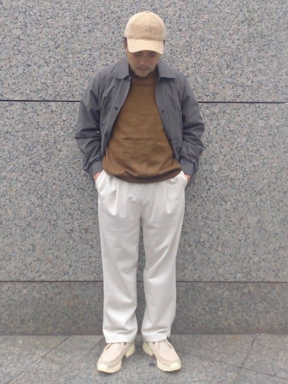 【OUTER : ”DRY TECH” BLOUSON】 ◯着用カラー:グレー ◯着用サイズ:L ◯サイズ感:ややゆったり ◯素材感:起毛したメッシュ地の裏地あり 柔らかくストレッチ性があり、とても着やすいシャツアウター ◎スタイリングポイント◎ ナイロン素材のアウターとスウェットパンツの組み合わせはカジュアルさが出てしまうので、あえてインナーにハイゲージのニットを合わせ、大人なぽさが出るようにコーディネート 足元はスエード素材のシューズを合わせ、程よく抜け感が出る様に意識しました