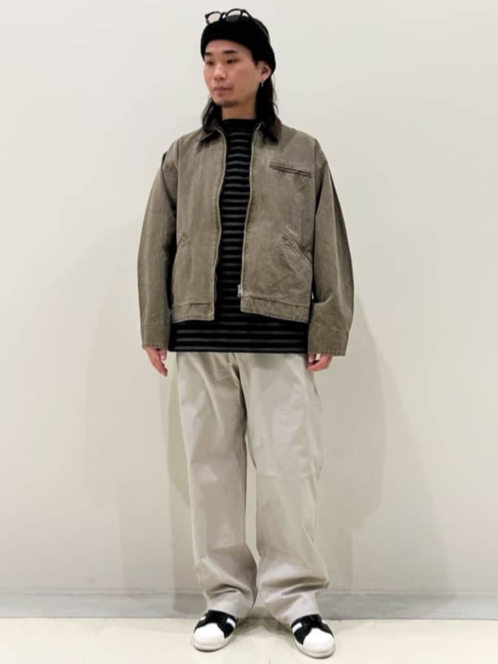 しっかりとしたダック地にフェード感のある染め、洗いをかけ着込んだような色落ち、アタリ感が出るように仕上げています。無骨ながら柔らかな風合いに仕上げ、着心地の良い着用感にしています。 衿のコーディロイの程よい配色がアクセントになるデザイン。 ゆったりとしつつ、野暮ったくないこなれたシルエットで幅広いシーズンにおすすめのアイテムです。 組下と合わせたセットアップスタイルもおすすめです。 品番:25030312501010 品名:ダックダブルニーパンツ 身長:170cm/体型:普通/普段サイズ:SorM/着用サイズ:M サイズ感:オーバーサイズ 素材感:厚すぎないダック生地 着心地:ゆとりがあり着やすい