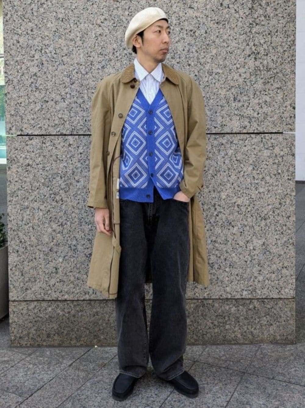 【タイルパターンカーディガン】 デザインが目を引く417 オリジナルのカーディガン 身長 : 185㎝ / 普段サイズ :LorXL / 着用サイズ : L :ややゆったりめ。 素材感 : 柔らかい。 着心地 : ゆったりとしていて動き易い。