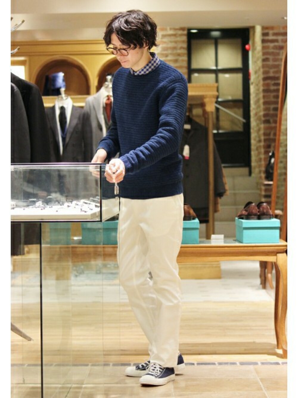 インディゴの鮮やかなブルーのニットにホワイトパンツを合わせた清涼感のあるコーディネート。足下にはコンバースオールスターのエクスクルーシブモデルを合わせて、春夏らしい軽い装いに。