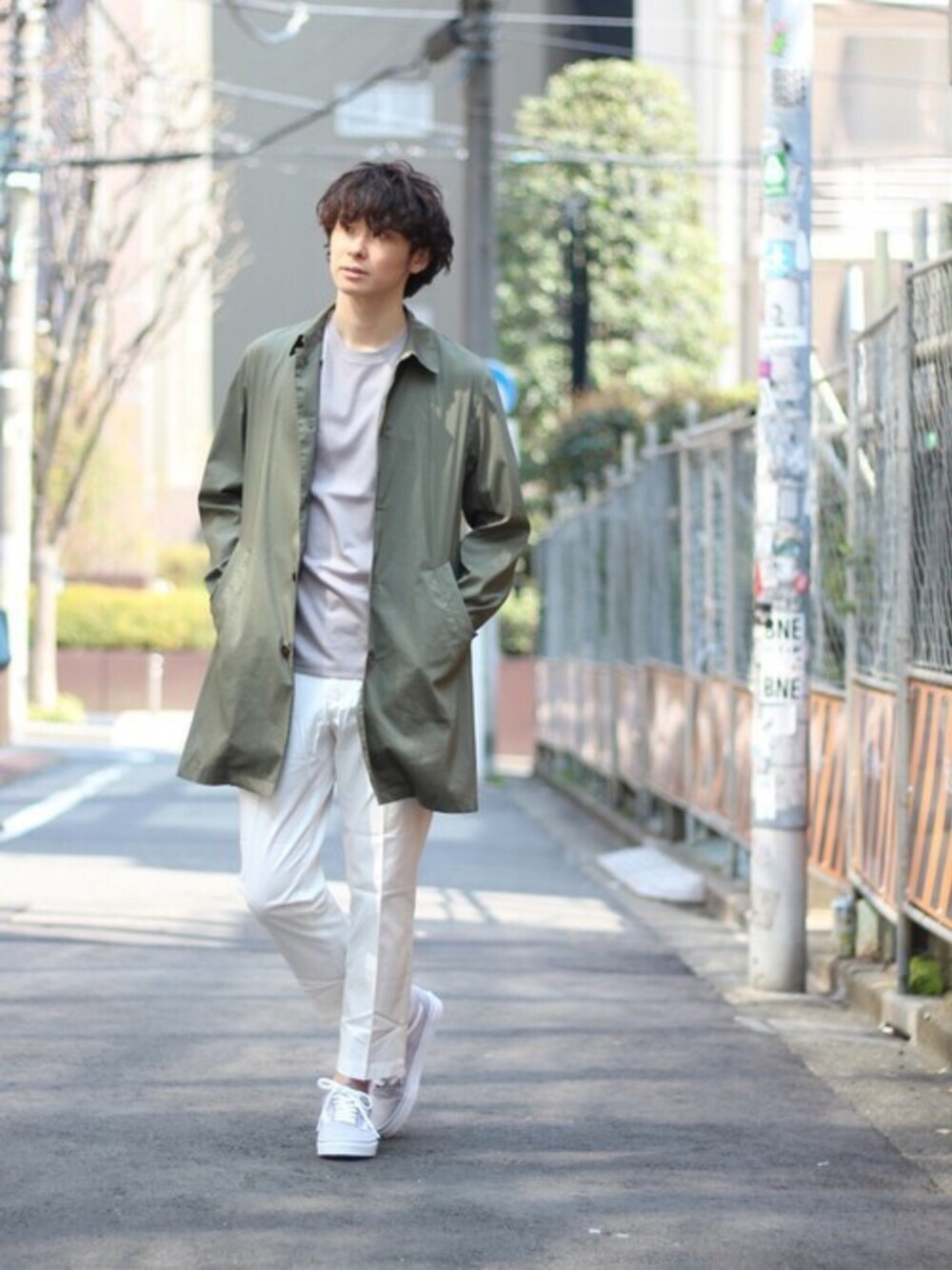 トレンドカラーのカーキのステンコートをメインに、ボトム&スニーカーはクリーンな色使いを意識し、シックな印象に。