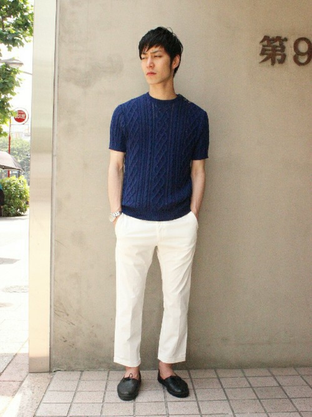 ブルー系のニット/セーターを着用したメンズの夏コーディネートの1枚目の写真