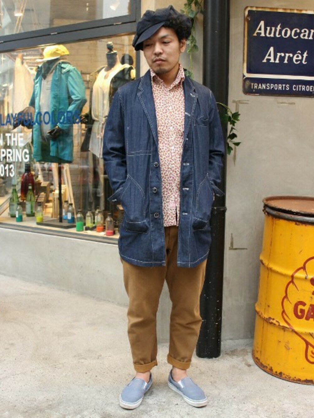 417byEDIFICEの新作コートはフランスの1950年代のワーク(アトリエ)コートをベースにしたデザインとなっています。春アウターらしい清涼感のある綿麻のライトデニム地を使用しヴィンテージライクな仕上がりとなっています。