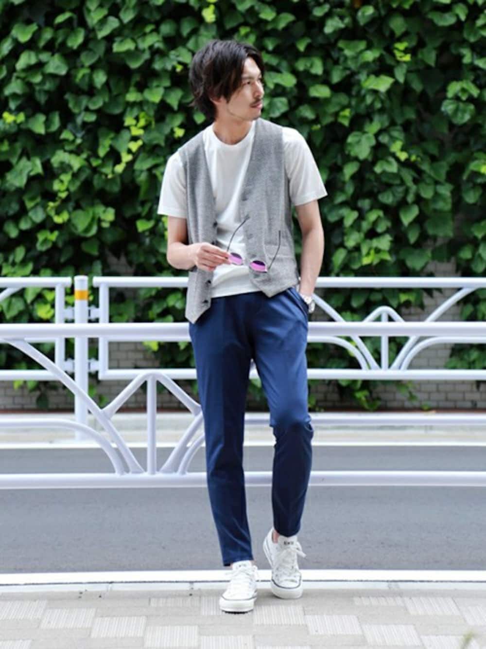 上品なネイビーブルーのパンツはスニーカーから、レザーシューズまで幅広く合わせやすく、クセが強くない細身のシルエットは様々なスタイルに使用できる万能アイテム。