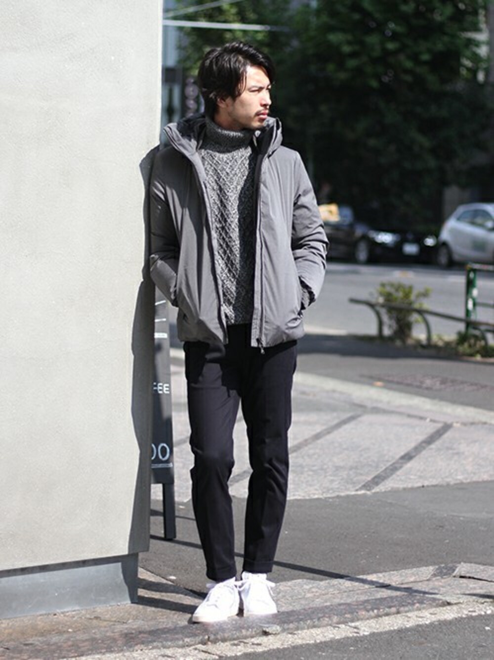 ストレッチのナイロン/ポリエステル生地に高機能フィルムを貼った表地を使用したダウンブルゾン。スニーカーを合わせたカジュアルスタイルでありながらもインナーのケーブルタートルネックニットがエレガントさをプラスしてくれます!