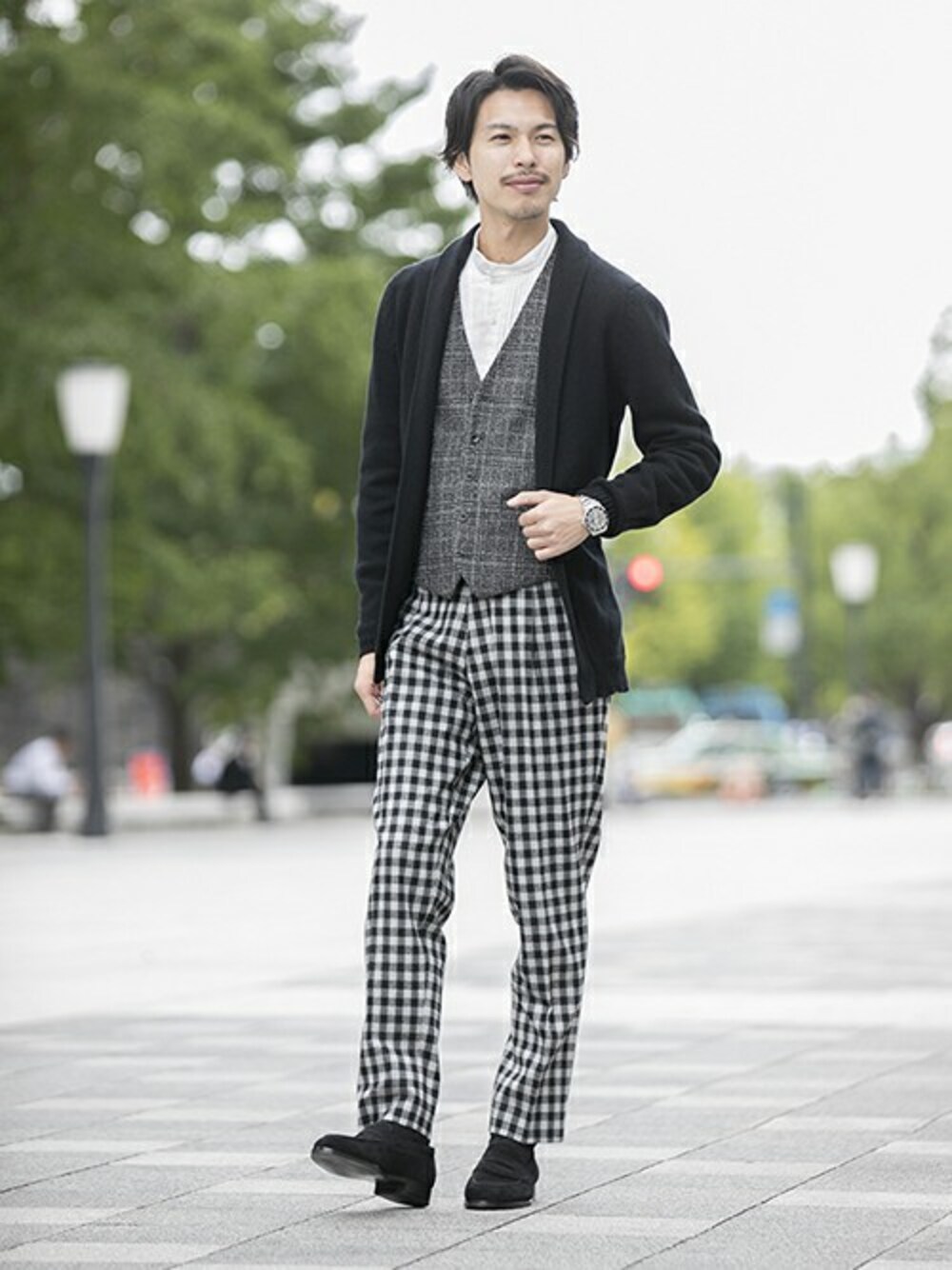ブラックやグレーといったシックな色合いは、休日スタイルでも欠かせません。ただ大人の品を演出するなら、ショールカラーのニットにバンドカラーシャツとジレを。チェック柄パンツもワンタックのゆとりのあるサイズ感なら、リラックスムードを高められます。最後の味付けにスウェードのローファーできちんとしたスタイリングに。