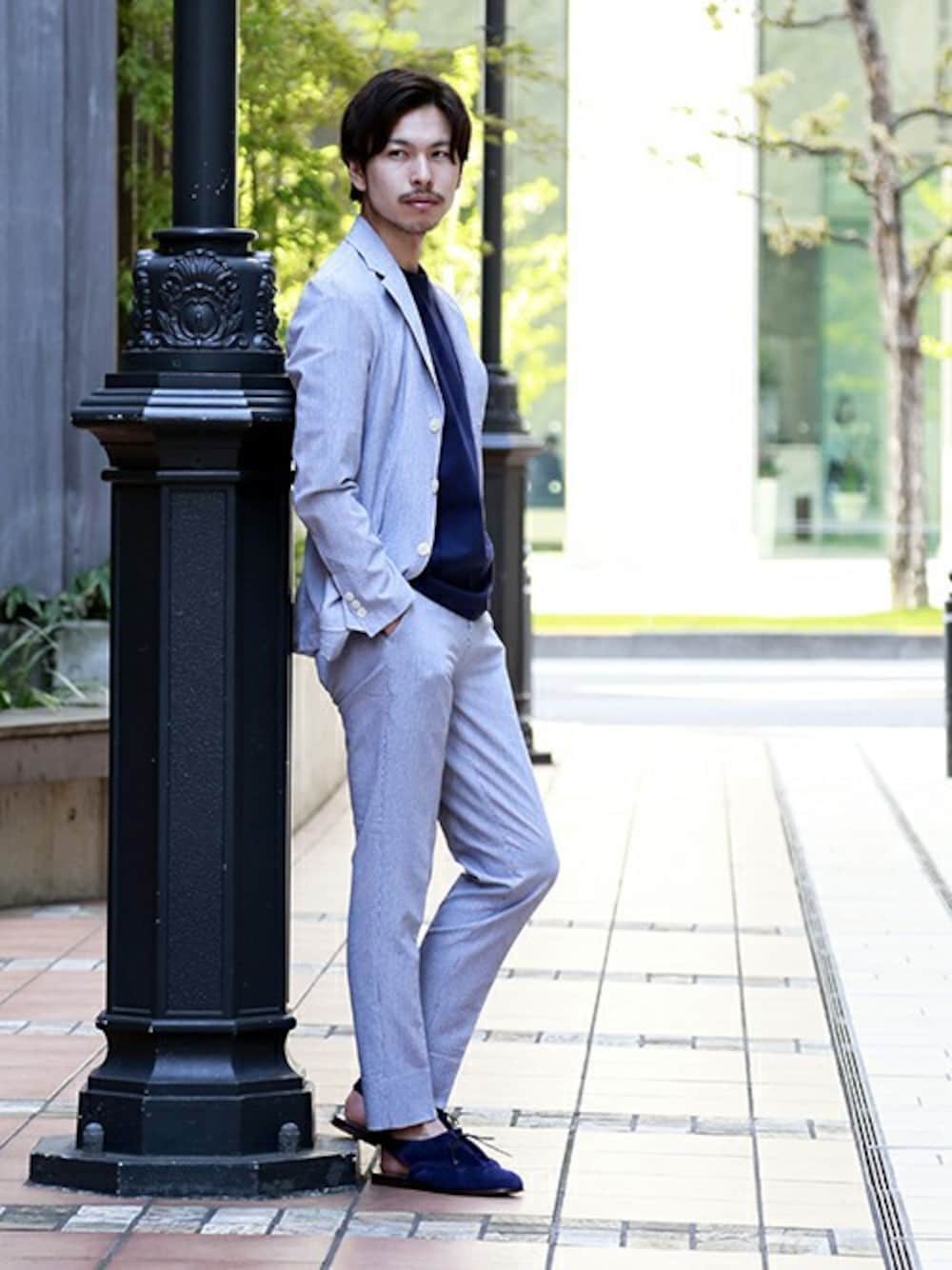 セットアップブーム到来前からクールビズの隠れ定番「ファンクションモバイル」の初となるシアサッカーのセットアップコーデ!雑誌「Begin6月号」とのタイアップとなる大注目のアイテムをネイビーで統一したスタイリングに落とし込みました!