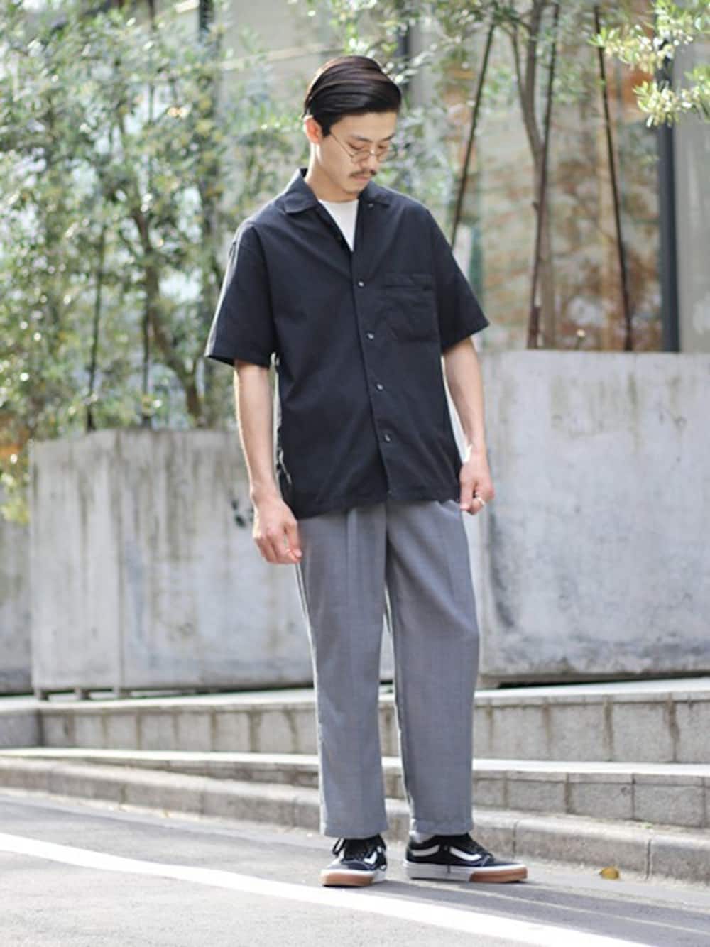 しなやかで上品なドレープ性を備えたレクセルと、ナチュラルな風合いで強度に優れたコットン素材を混紡したオープンカラーシャツ。全体的にワイドシルエットでありながらも、ダークトーンでまとめることで都会的な印象に。