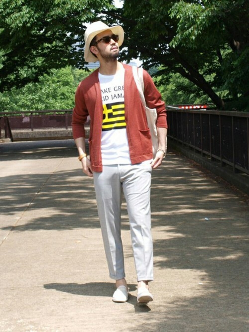 オレンジのカーディガンにベージュのハットとリラックスした大人のスタイルにロゴのイエローが挿し色に。