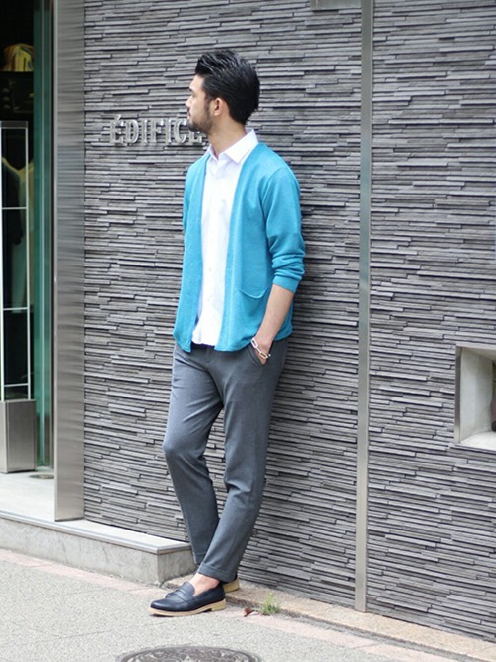 今時期に軽く羽織りたいカーディガンは、鮮やかなブルーをピックアップ。シャツ×スラックスでシックに合わせれば、より都会的な雰囲気を演出してくれます。