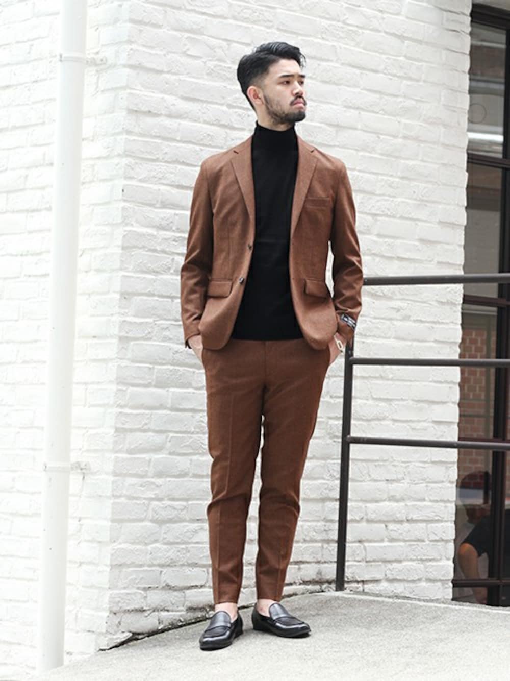 Super100's原料の「ウールストレッチサキソニー」を使用したEDIFICEオリジナルのセットアップアイテム。ブラウンのセットアップには、ブラックのインナーとシューズを合わせることでモダンな雰囲気をプラスしてくれます。