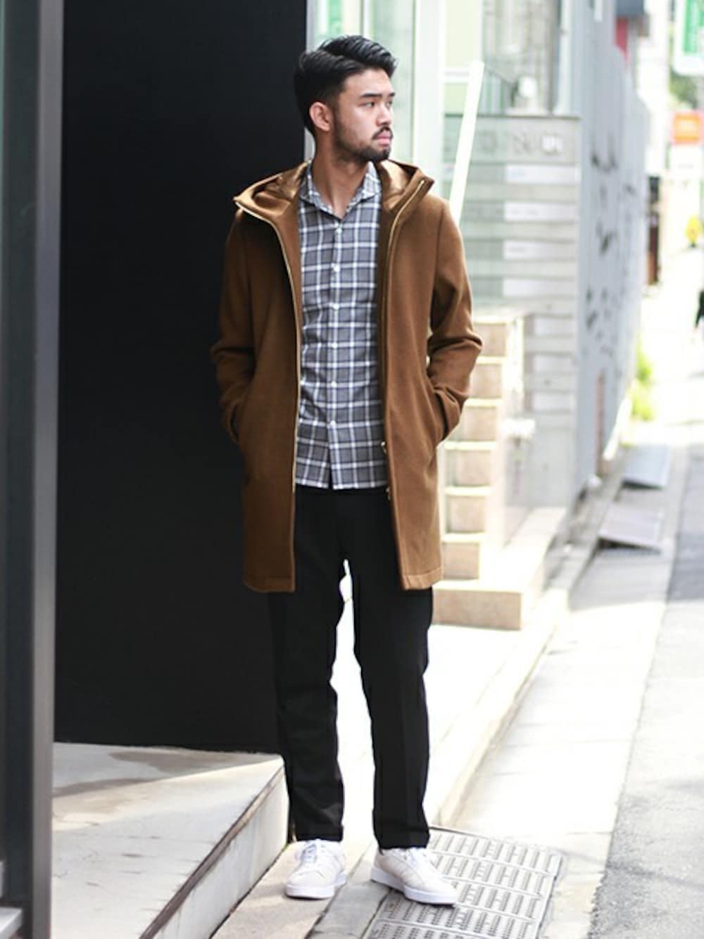 デティールを極力そぎ落とし、ミニマルなデザインにしたメルトンフードコート。キャメルのアウターに対して全体的にブラックのアイテムを合わせることでシックで上品な雰囲気を与えてくれます!