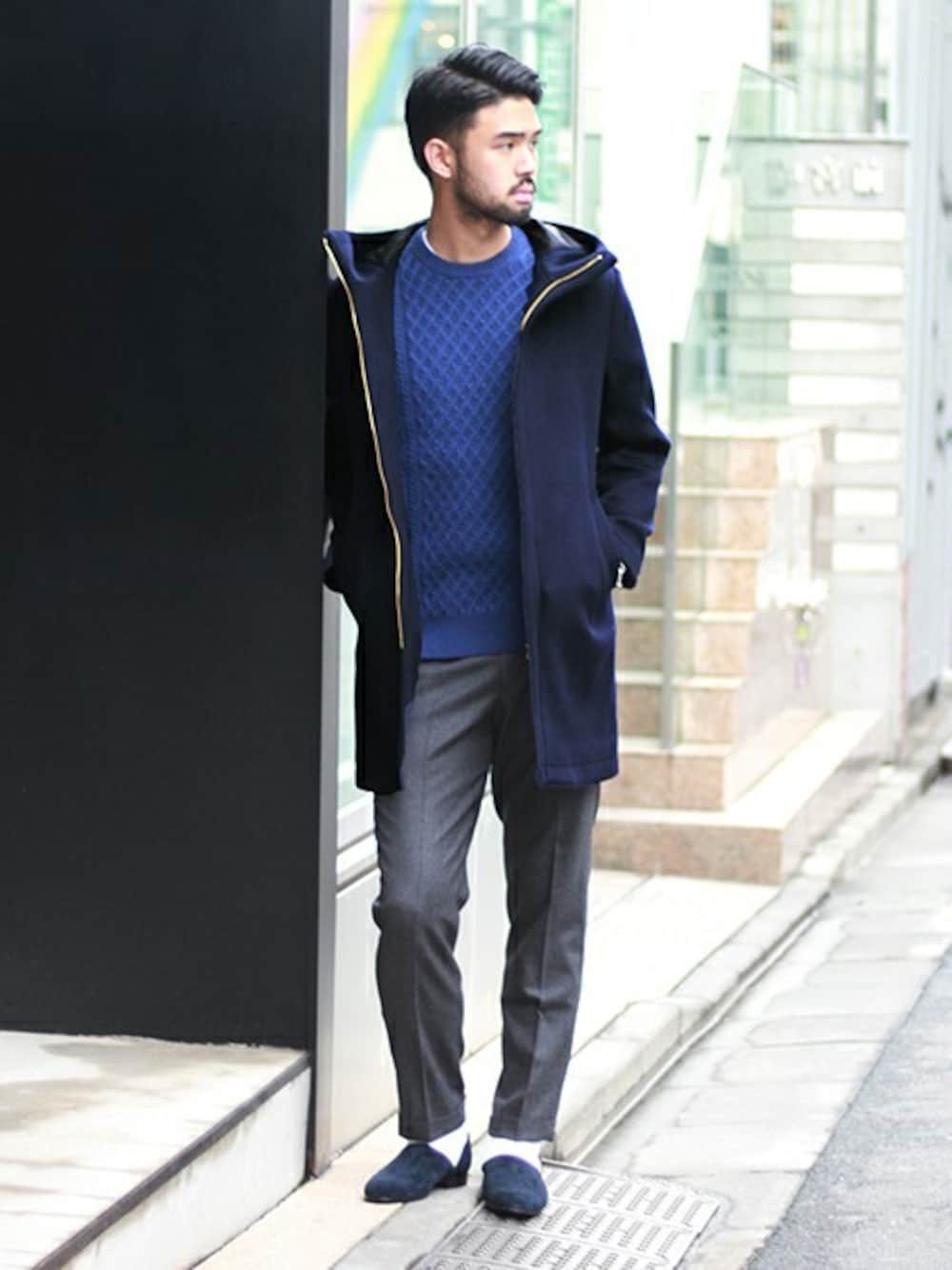 ビーバー仕上げ(ウール生地を縮絨してから、起毛し同じ長さに刈り込む)したウールコート地を使用したフードコートは、王道の「ネイビー」をチョイス。ワントーンコーデでまとめることで、より上品な印象を与えてくれます!