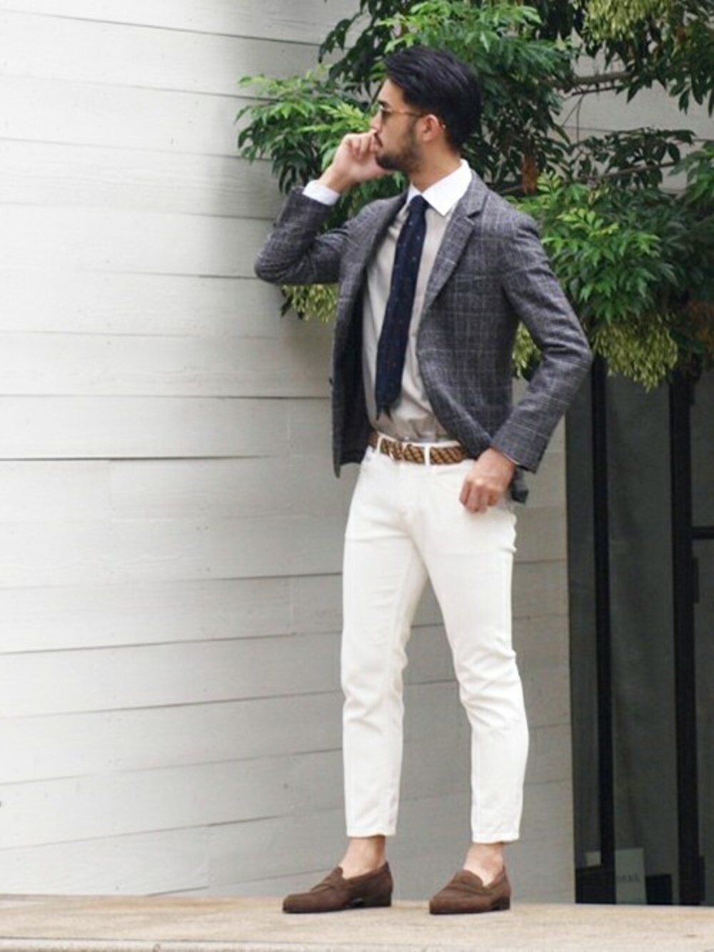 柄のジャケットは、クラシックになりがちですが、グレージュのクレリックシャツにブラックのドットネクタイを合わせればモードな雰囲気に。