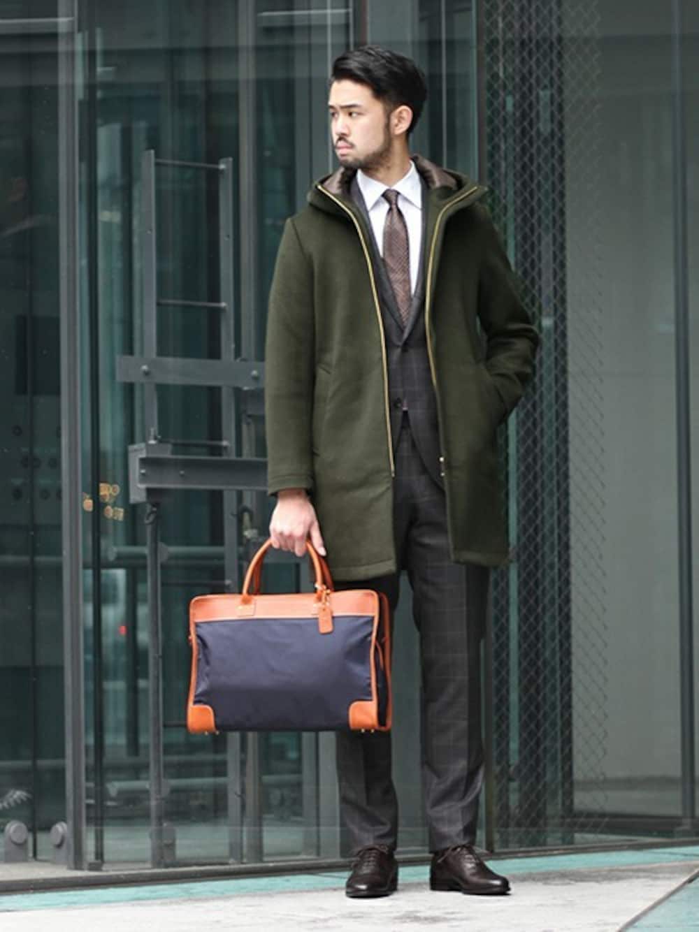 ビーバー仕上げ(ウール生地を縮絨してから、起毛し同じ長さに刈り込む)したウールコート地を使用したフードコート。カジュアルになりがちな「カーキ」のアウターは、ブラウンの小物使いでモダンな印象に。