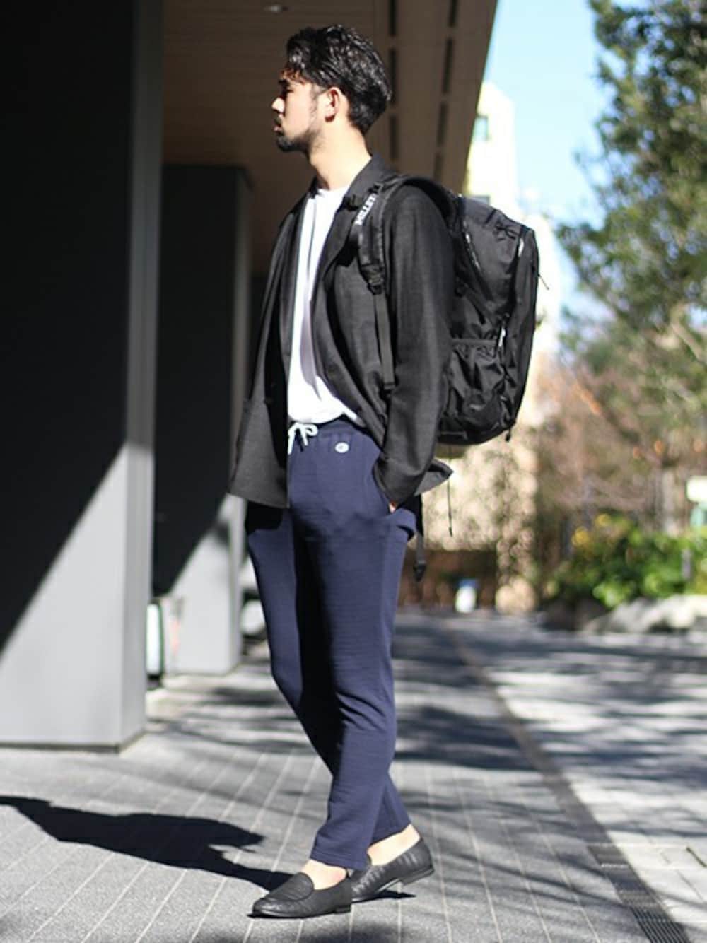 「Champion」との別注スウェットパンツにジャケット×レザーシューズを合わせた都会的スポーツMIXスタイル!休日には、大容量の「MILLET」のバックパックも欠かせません!