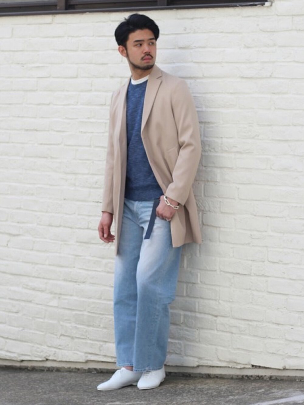 クリーンな色味が印象的なチェスターコートをメインにEDIFICEらしくシックなバランス感にまとめた大人カジュアルコーデの提案です。