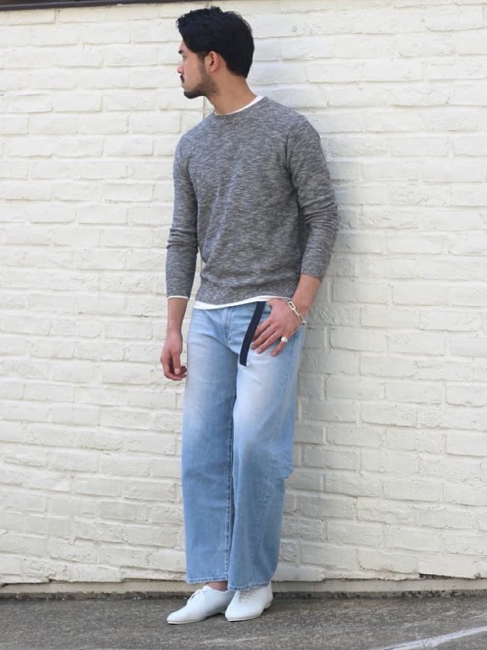 1枚でレイヤードスタイルを楽しめるトップスをメインにワイドなデニムを合わせたメリハリをつけたスタイルです。足元はきれい目なダンスシューズを合わせEDIFICEらしくシックなバランス感にまとめています。