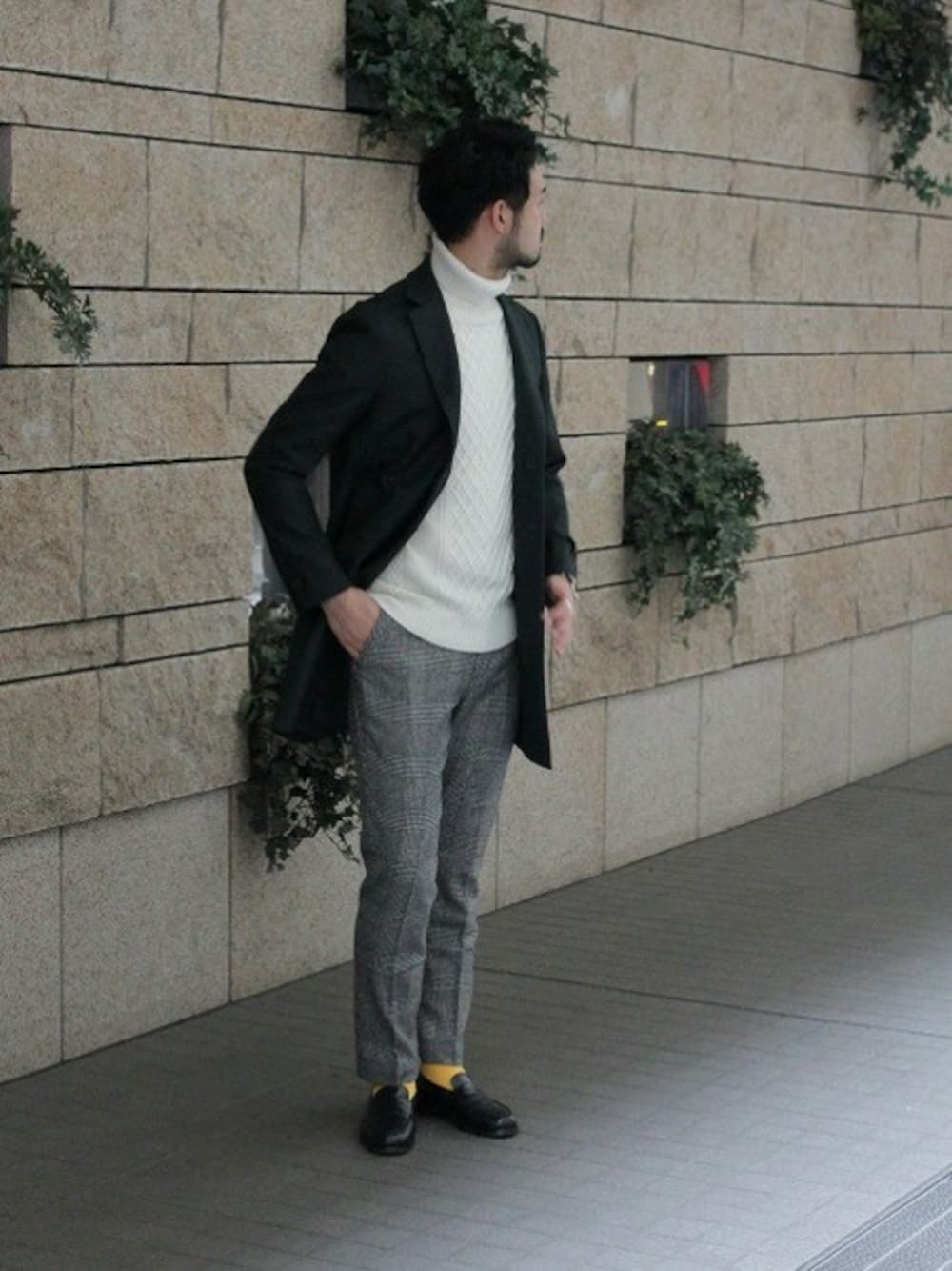 柔らかい素材感と色味が特徴的な人気コートを取り入れたブリティッシュスタイル。 落ち着いた色の合わせの中にソックスで色を差しているのがポイントです。
