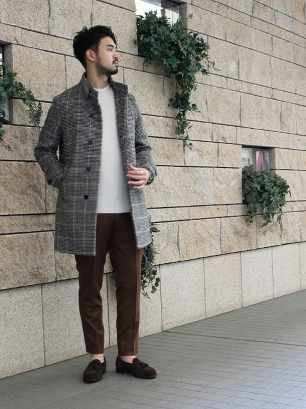 TERAのステンカラーコート「Super100s blend チェック スタンドコート」を使ったコーディネート