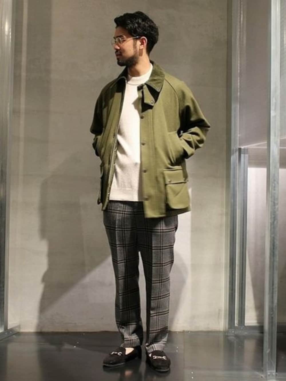 ブリティッシュ×リラックス 野暮ったくなりすぎないウールバブアーにカシミアニットを合わせ、今年らしいチェックパンツで。