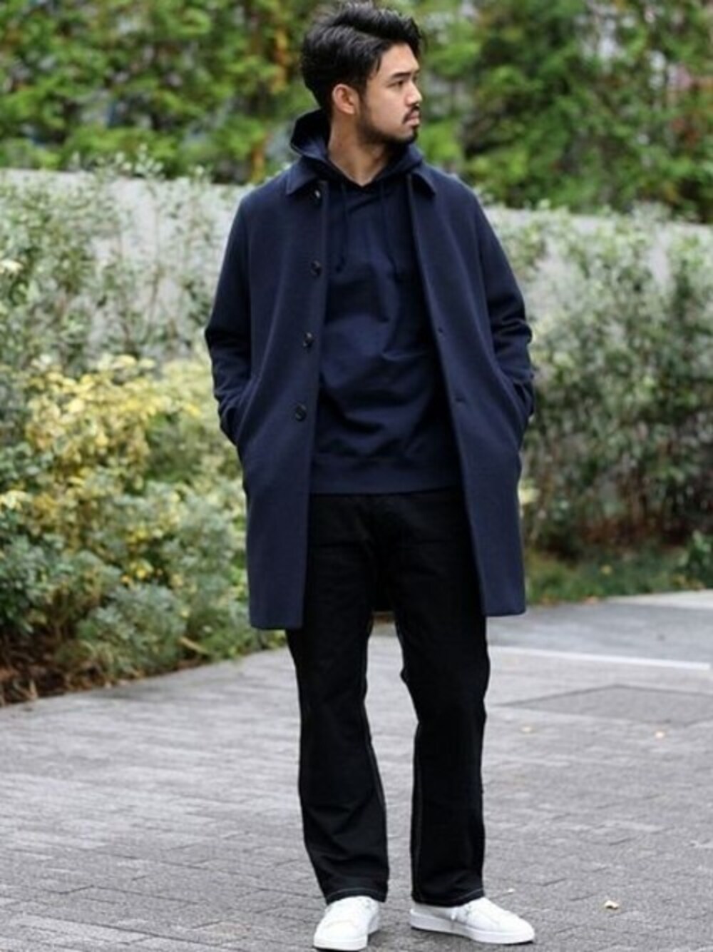 大人のパーカー着こなし - ネイビー - パーカーの重ね着はステンカラーコートと相性抜群。
