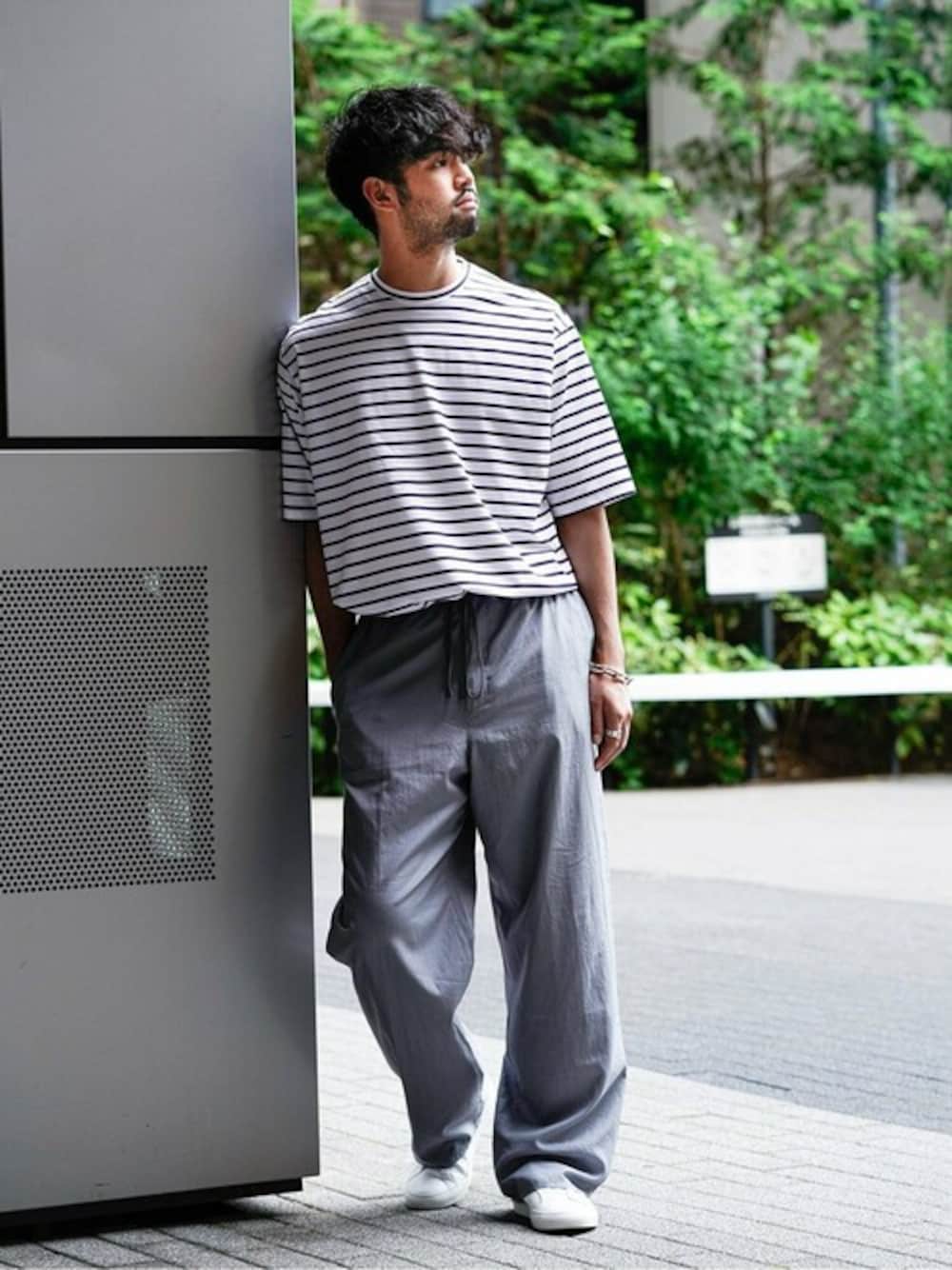 【オーバーサイズ 5分袖 ボーダー Tシャツ】 ゆったりとしたシルエットのボーダーカットソー。 細めのピッチのボーダーがスマートな印象を演出しながら5分袖のデザインとゆったりとしたシルエットが大人な雰囲気を醸してくれます。一枚でもサマになるリラックス感のあるTシャツです。 ワイドパンツにタックインをして、旬なリラックススタイル。 身長:183cm / 普段サイズ: 50 XL / 着用サイズ:L / 体型:ガッチリ体型 サイズ感: ゆとりのあるサイズ 素材感:コットンのハリ感ある素材感 着心地: 身幅もあり、リラックス感ある着心地