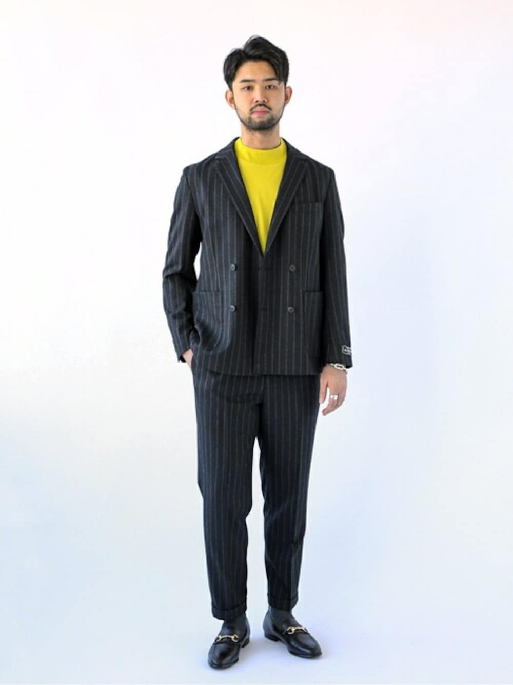 【メランジパターン ダブルブレスト セットアップ】 20代後半/身長:183cm/体型:ガッチリ/普段サイズ:XL/着用サイズ:L サイズ感:肩回りはカットソーでややタイトなサイズ感ですが、身幅があるダブルのジャケットなので、全体的な着用バランスは丁度良いです。パンツはタック入りの1プリーツテーパードパンツなので、腿回りが程よくゆとりがありLサイズで丁度良く着用できます。また裾がダブル仕様の為レングスも丁度良いです。 素材感:シングルのセットアップと同じ生地感なので、同様にウール感はありますが、上品に見え「ちゃんとした感」が出る印象の良い生地です。 プライべ―トはもちろん、リモートワークなど昨今の働き方を考えれば、ビジネス使いも出来るのが人気のポイントです。 着心地:シングルのジャケットタイプより身幅に余裕がありストレッチ性のある素材を使用しているため、着心地は楽に着用できます。またカジュアルセットアップシリーズは肩の芯も薄いため、動作のしやすい着心地です。 Instagram ⇒ towerofterada