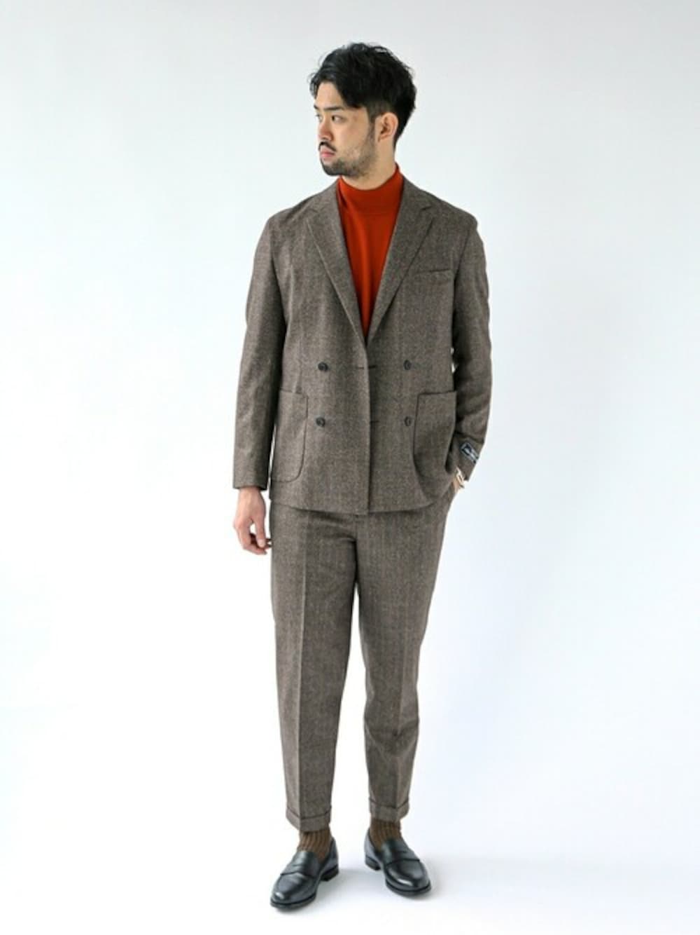 【メランジパターン ダブルブレスト セットアップ】 20代後半/身長:183cm/体型:ガッチリ/普段サイズ:XL/着用サイズ:L サイズ感:肩回りはカットソーでややタイトなサイズ感ですが、身幅があるダブルのジャケットなので、全体的な着用バランスは丁度良いです。パンツはタック入りの1プリーツテーパードパンツなので、腿回りが程よくゆとりがありLサイズで丁度良く着用できます。また裾がダブル仕様の為レングスも丁度良いです。 素材感:シングルのセットアップと同じ生地感なので、同様にウール感はありますが、上品に見え「ちゃんとした感」が出る印象の良い生地です。 プライべ―トはもちろん、リモートワークなど昨今の働き方を考えれば、ビジネス使いも出来るのが人気のポイントです。 着心地:シングルのジャケットタイプより身幅に余裕がありストレッチ性のある素材を使用しているため、着心地は楽に着用できます。またカジュアルセットアップシリーズは肩の芯も薄いため、動作のしやすい着心地です。 Instagram ⇒ towerofterada