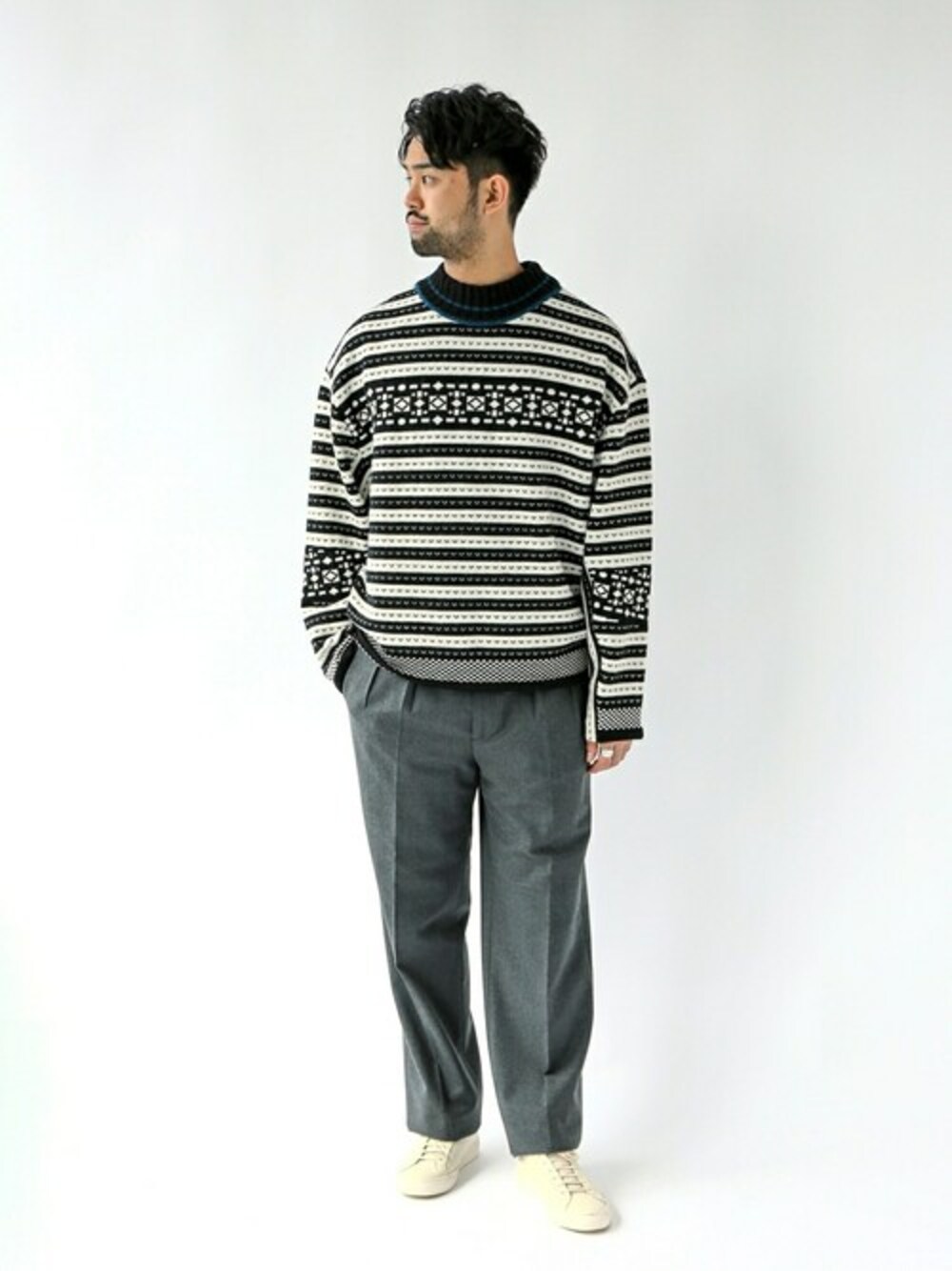 【リラックス ジャカード ボーダーニット】 20代後半/身長:183cm/体型:ガッチリ/普段サイズ:XL/着用サイズ:F サイズ感:商品名にあるリラックスなサイズ感の為、自身の体型でもゆったりと着れるサイズ感です。着丈は長すぎずで丁度良く、袖丈は長さを持たせたデザインの為、クッションを持たせたゆるい着こなしができる良いサイズ感です。 素材感:上質ウールを使用した素材を使用。ジャガードボーダーの見た目から硬く重そうな印象を持たれがちですが、柔らかく重くないウールの素材感です。 着心地:ずっしりしていそうな見た目に反し、重くなく柔らかい上質ウールを使っているため、着心地良いデザインです。肉感はしっかりしているので、コートを羽織る際はコートのサイズ感に注意が必要です。・ Instagram ⇒ towerofterada