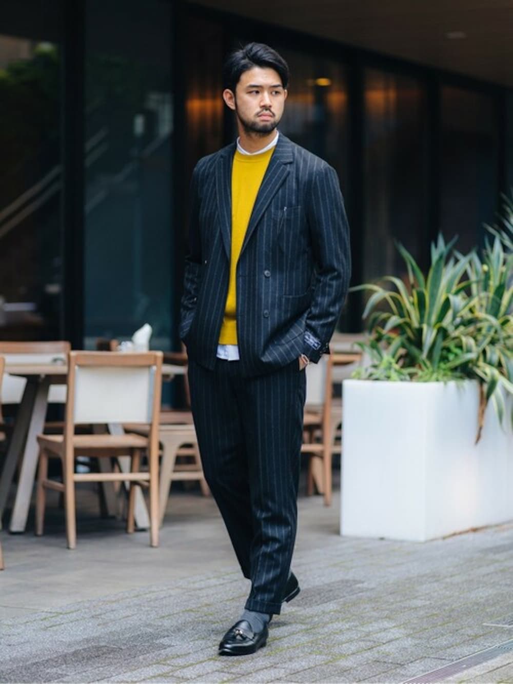 【メランジパターン ダブルブレスト セットアップ】 20代後半/身長:183cm/体型:ガッチリ/普段サイズ:XL/着用サイズ:L サイズ感:肩回りはカットソーでややタイトなサイズ感ですが、身幅があるダブルのジャケットなので、全体的な着用バランスは丁度良いです。パンツはタック入りの1プリーツテーパードパンツなので、腿回りが程よくゆとりがありLサイズで丁度良く着用できます。また裾がダブル仕様の為レングスも丁度良いです。 素材感:シングルのセットアップと同じ生地感なので、同様にウール感はありますが、上品に見え「ちゃんとした感」が出る印象の良い生地です。 プライべ―トはもちろん、リモートワークなど昨今の働き方を考えれば、ビジネス使いも出来るのが人気のポイントです。 着心地:シングルのジャケットタイプより身幅に余裕がありストレッチ性のある素材を使用しているため、着心地は楽に着用できます。またカジュアルセットアップシリーズは肩の芯も薄いため、動作のしやすい着心地です。 Instagram ⇒ towerofterada