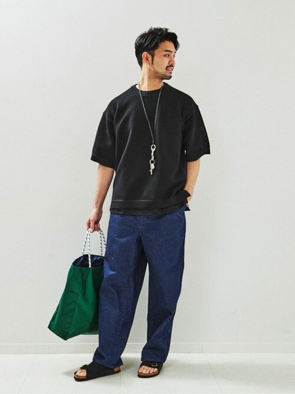 【スポンディッシュ オーバーサイズ ニット Tシャツ】 30代前半/身長:183cm/体型:ガッチリ/普段サイズ:XL/着用サイズ:L コーディネートポイント:ニットTシャツをメインに夏に男性らしくシンプルに着用できるようまとめたコーデ。シンプルだからこそ小物をしっかりと使うことでこなれた印象を出すことが出来ます。 着心地・サイズ感:自身の体型でLサイズを着て、かなりゆったりと着用できるオーバーサイジングです。生地感は非常に柔らかくかつ軽い素材感に加え、ニット編みで目が詰まりすぎてないので、シアー感のある通気性を持つのが特徴。比較的肉感のある生地ですが、オーバーサイジングのシルエットも合わさり春はインナー使いに、夏場は一枚使いでサマになるオススメの一着です。 ◆Instagram ⇒ towerofterada Instagramも更新しております。 お気軽にフォロー、コメントもお待ちしております。