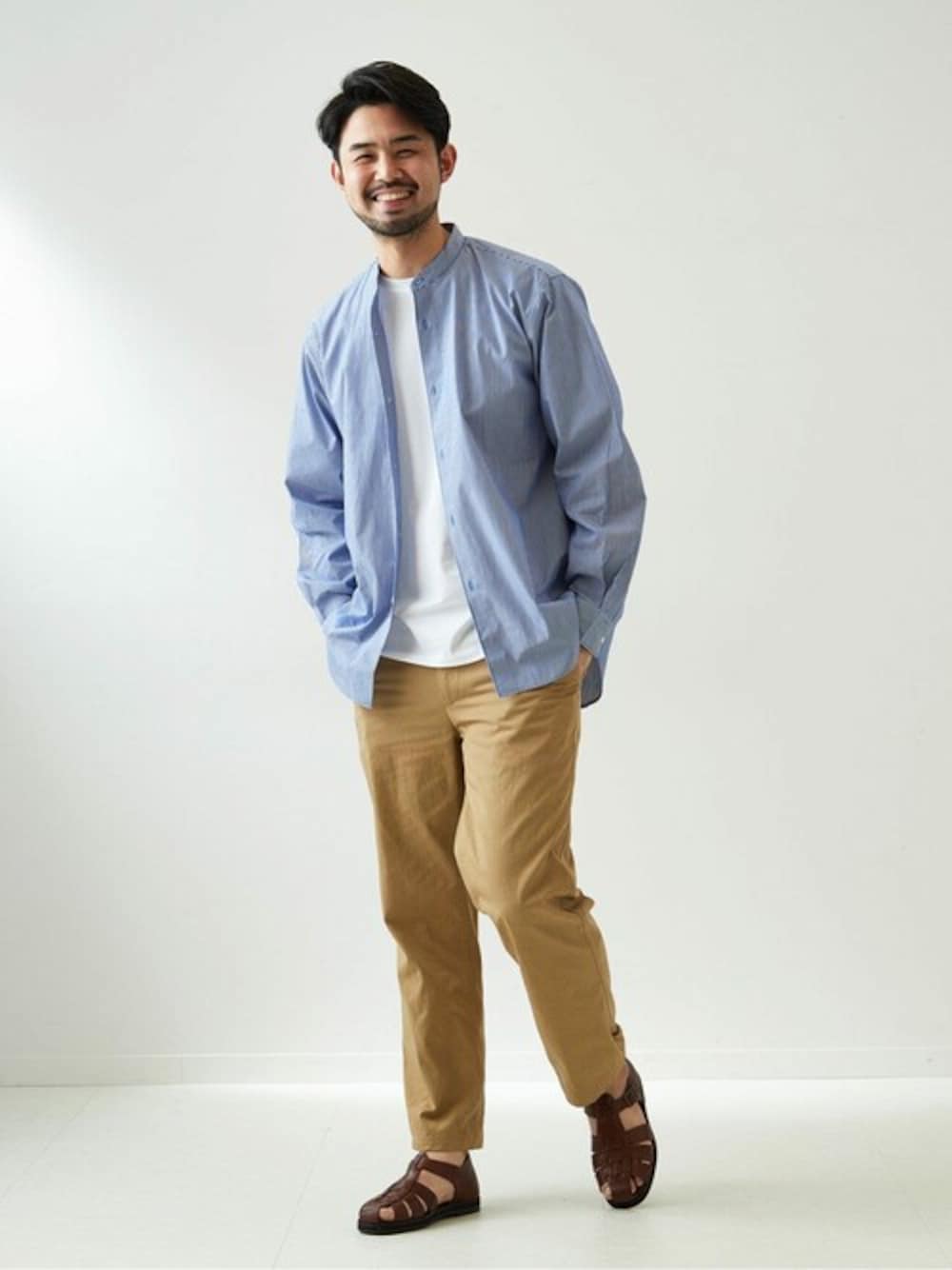 WEB限定【シャツ+カットソーの2点セット】ストライプノーカラー / Tシャツ 30代前半/身長:183cm/体型:ガッチリ/普段サイズ:XL/着用サイズ:XL コーディネートポイント:ブルーストライプシャツにベージュパンツの爽やかなコーデ。袖をまくれば夏まで羽織として活躍します。 着心地・サイズ感:XLで少しリラックスしたサイズ感。細目に着用するならLサイズでも着用できます。