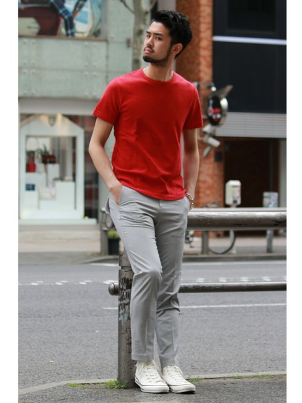 着用感抜群の梨地Tシャツ! アクセントカラーのレッドを合わせてみました。 白シャツとのレイヤードでもバランス良くコーデが可能です。